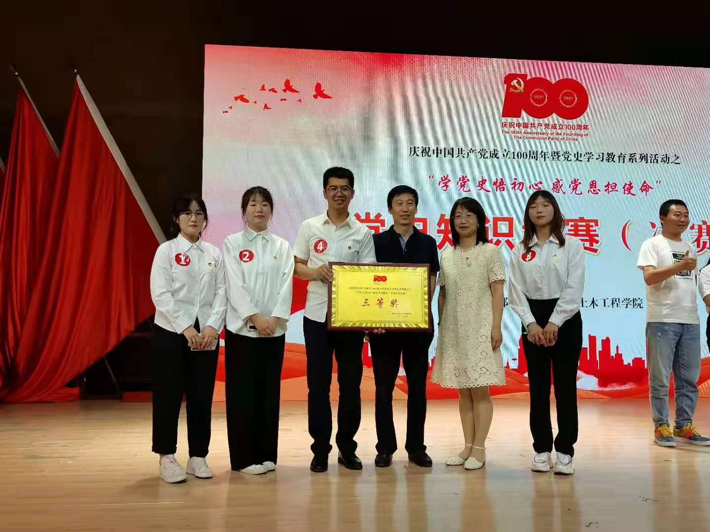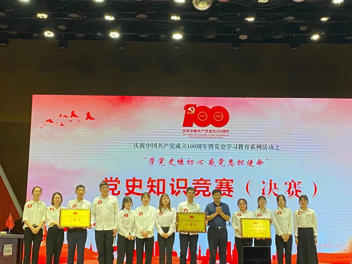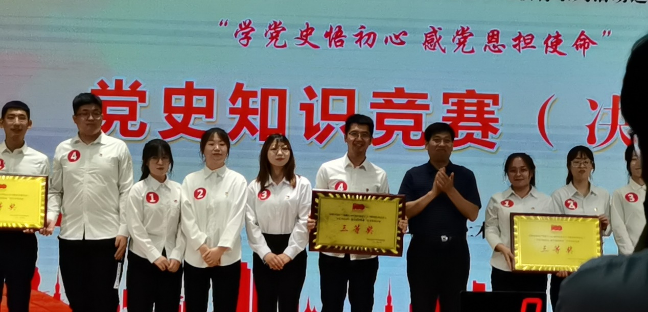 在此前的初赛中,公司全体师生党员以优异的成绩进入了决赛环节,全校只有八个学院进入了决赛。决赛中,公司选派高立鑫(教师)、吴艳、李晓慧、王爽爽四名选手组成的代表队代表学院参加了本次比赛,经过努力备赛最终在决赛中取得了三等奖的好成绩。公司师生在中国共产党建党100周年之际,积极学习党史,通过参加党史知识竞赛进一步提升了党史知识素养和水平。